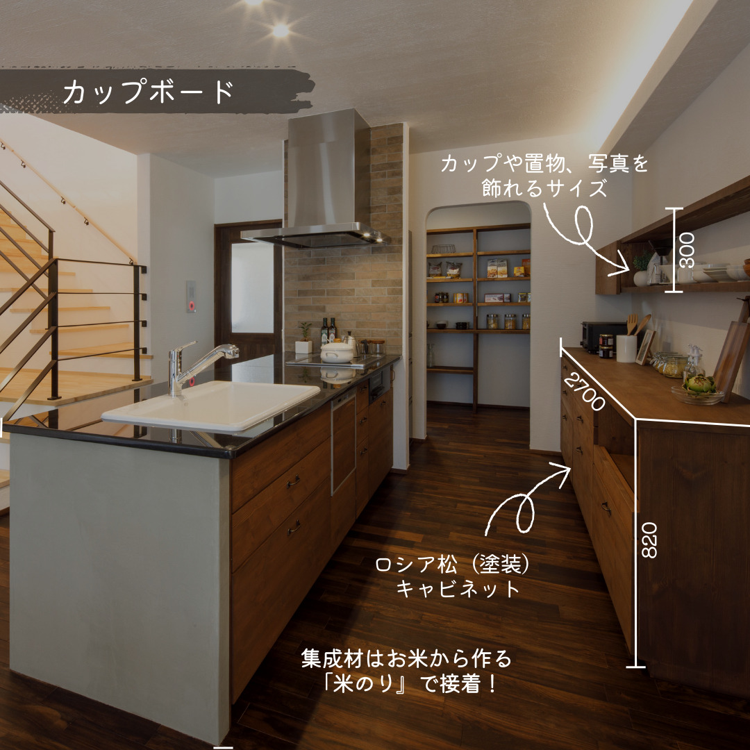 キッチン背面には、同じロシア松で統一された造作カップボードを設置。お皿や調味料の収納だけでなく、カップや写真を飾って“見せる収納”としても楽しめます。