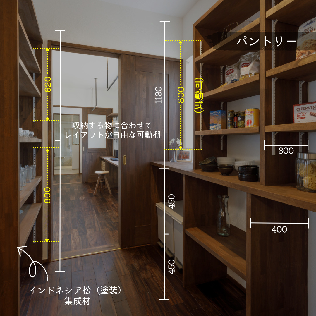 キッチン横には、インドネシア松(塗装仕上げ)を使ったパントリーを併設。可動棚になっているため、収納する物に合わせて高さを自由に変更できます。