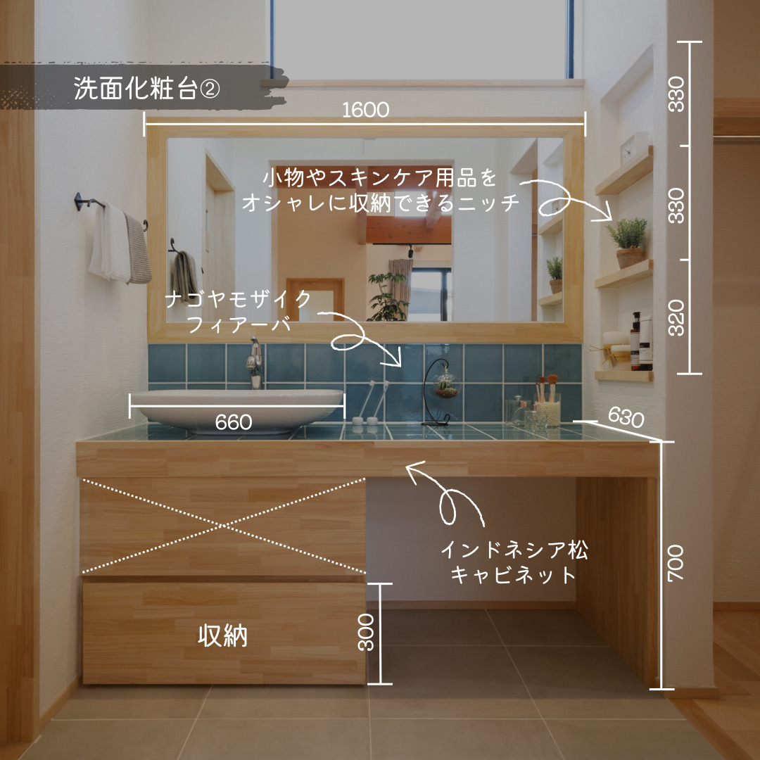 2台目の洗面は、ブルーグリーンのタイルが印象的なナチュラルテイスト。小物やスキンケア用品を飾れるニッチ収納を備え、暮らしに“見せる楽しさ”をプラスしています。