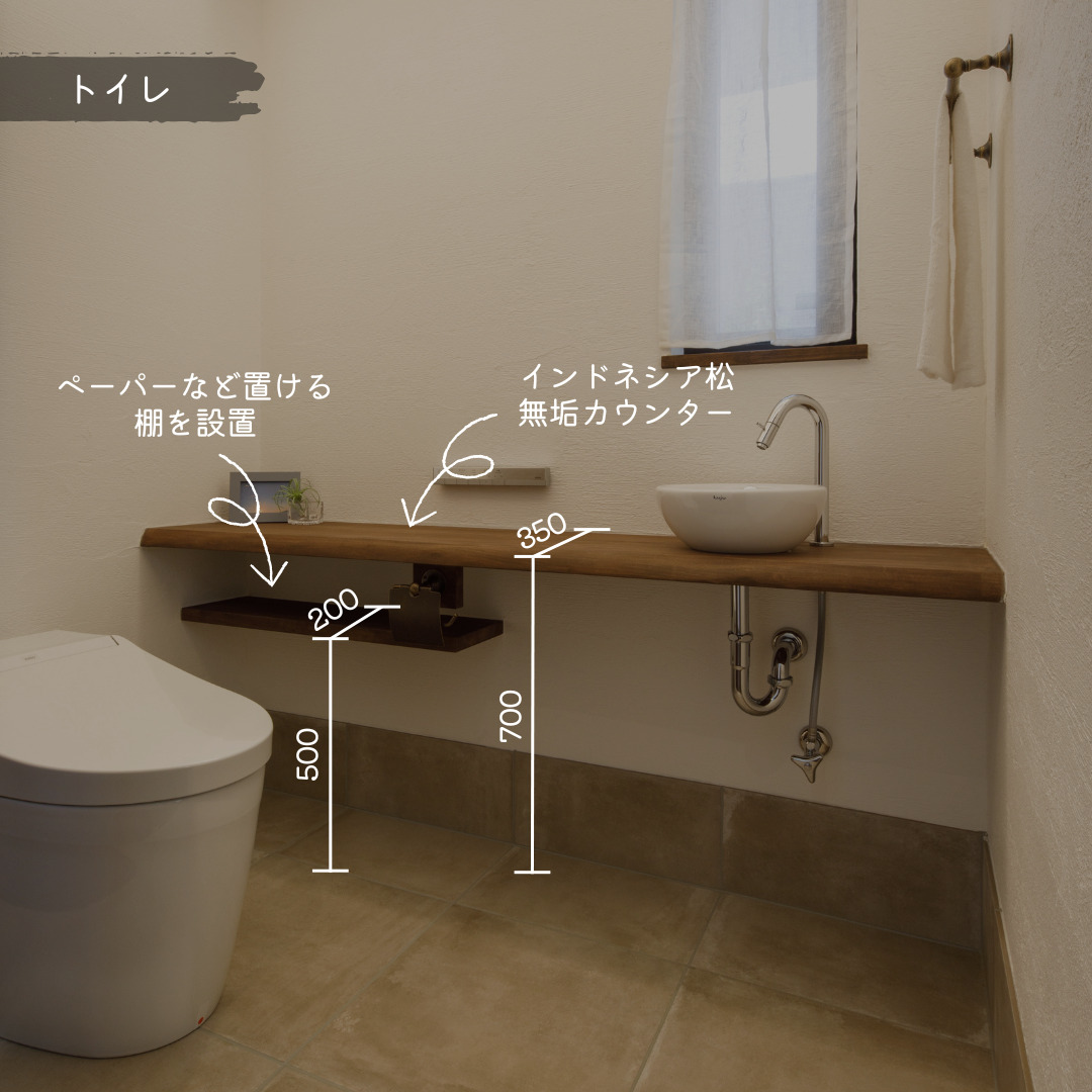 トイレには、無垢のインドネシア松を使った手洗いカウンターを設置。奥行きわずか35cmのスリム設計で、限られた空間にもすっきり収まります。