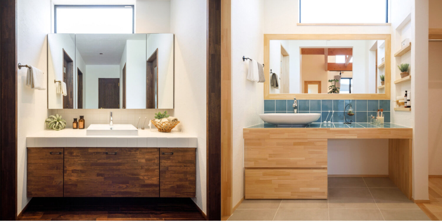 【造作家具サイズ紹介】タイルと木のぬくもりが調和する洗面台とトイレ手洗い