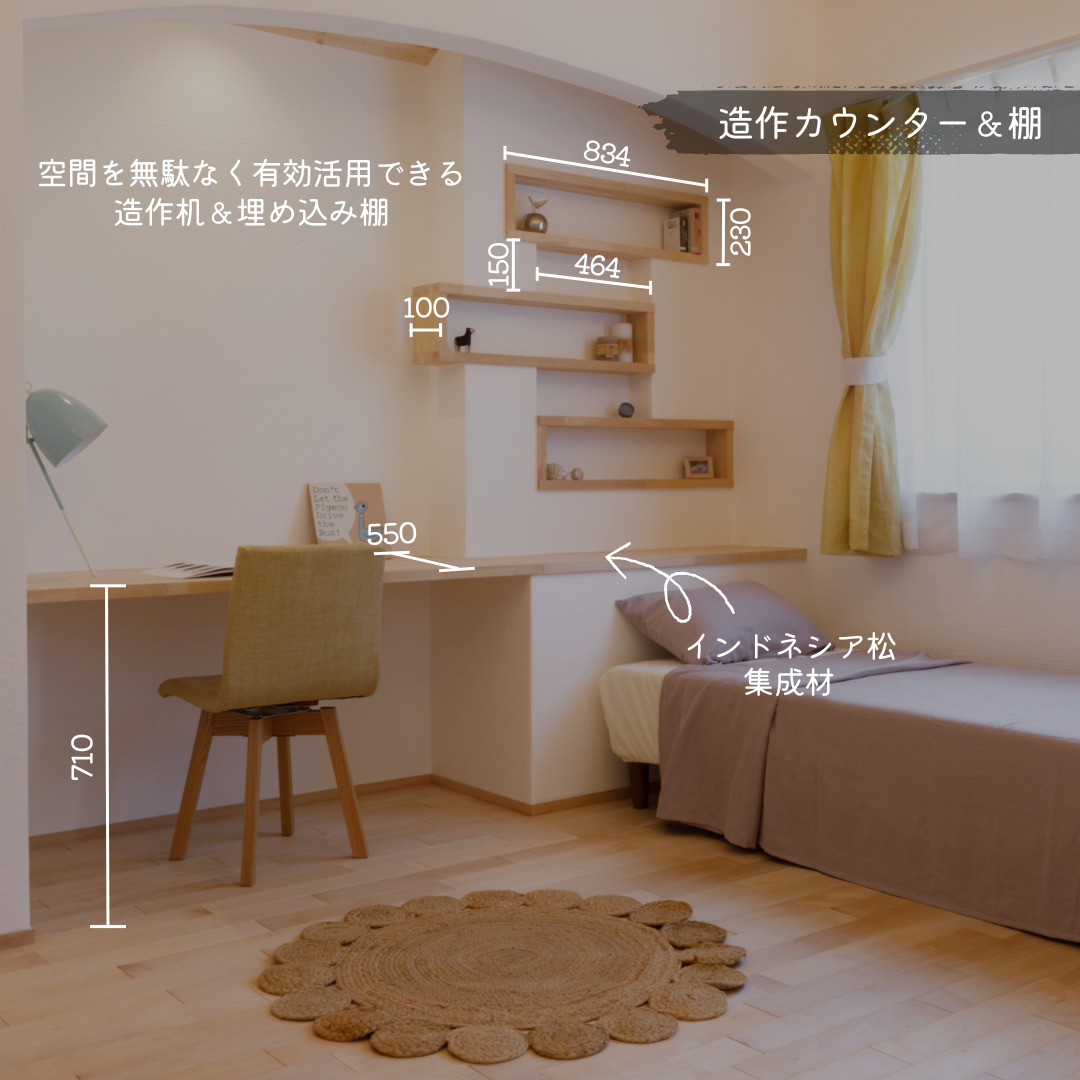 壁の一部を利用した造作カウンターと埋め込み棚。デッドスペースを有効活用できる設計で、学習スペースやワークコーナーとしても活躍します。