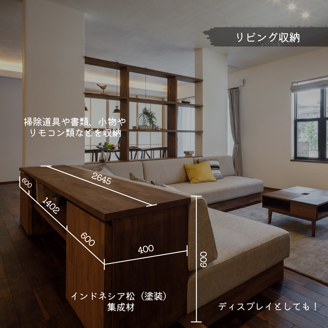 背面カウンターとしてディスプレイにも使え、空間のアクセントにもなります。家具を置くよりも動線が広く、リビングを広く見せる効果も。