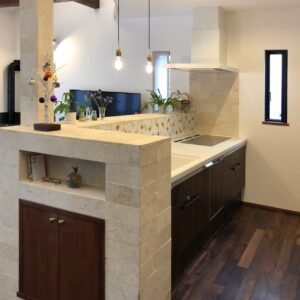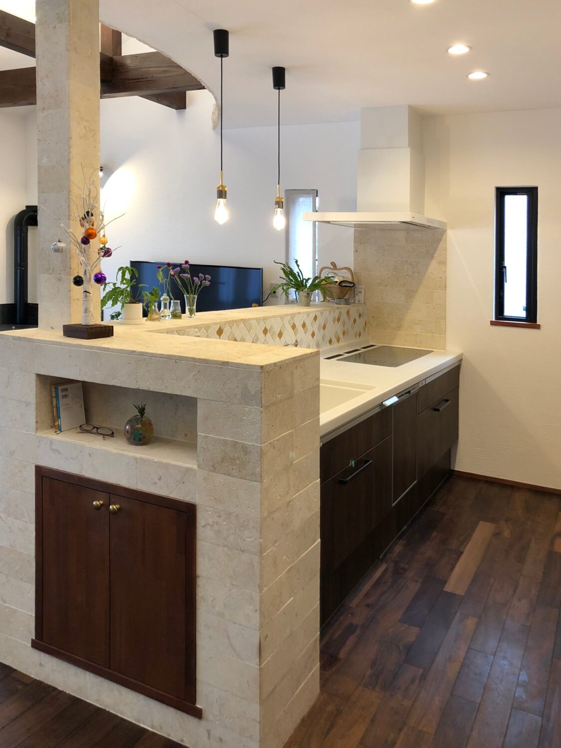 この石(コーラルストーン)のキッチンは、無添加住宅新潟西展示場にあって、「いいな」と思って採用しました。