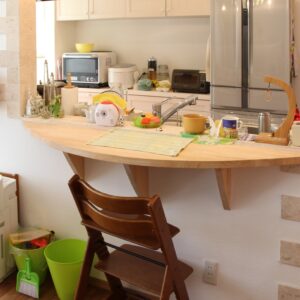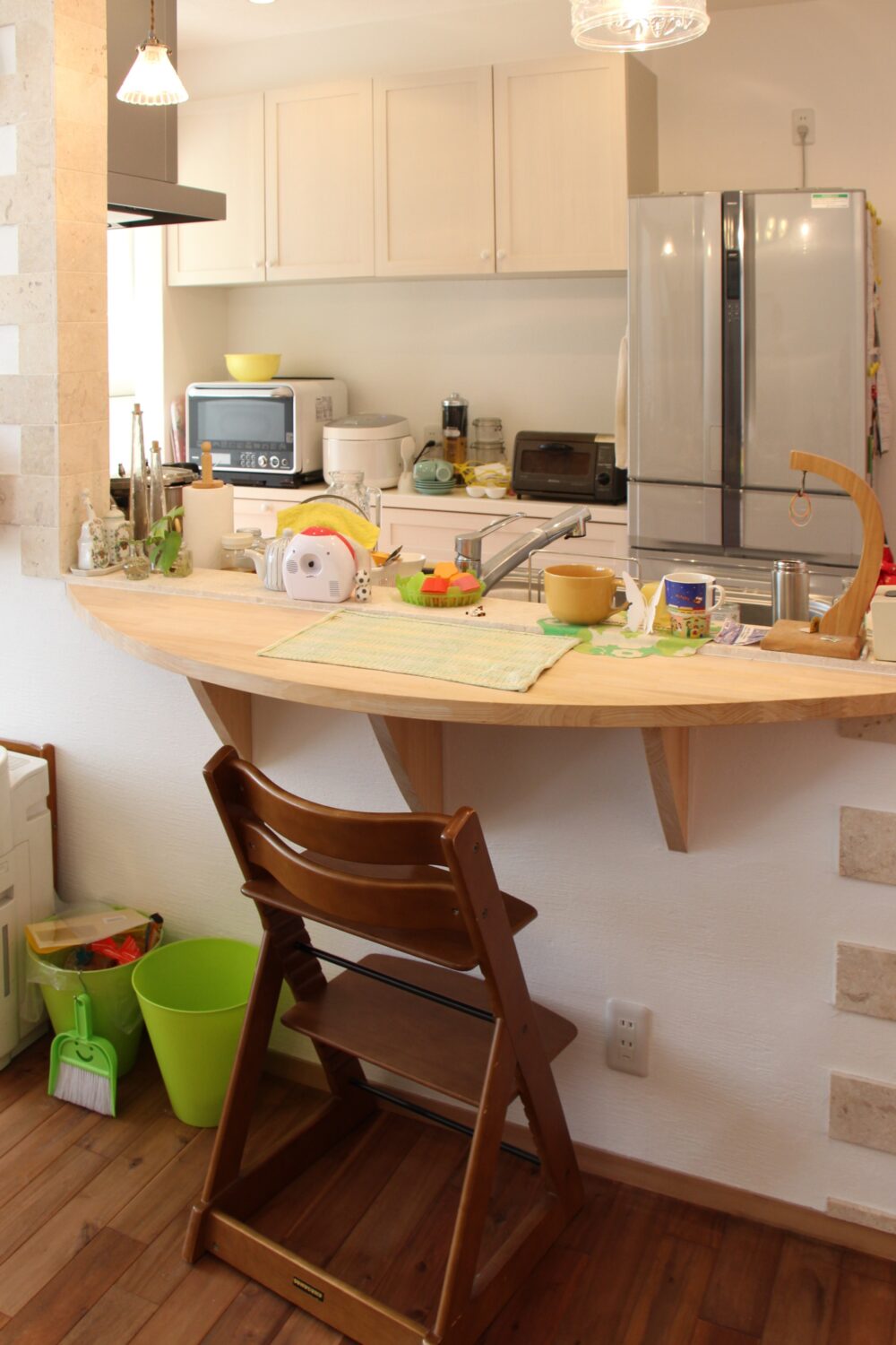 奥様: 特にキッチンのタイル床を斜めに張る作業は、見ていて本当に大変そうでした。そのご苦労のおかげで、すごく可愛いキッチンになりました。