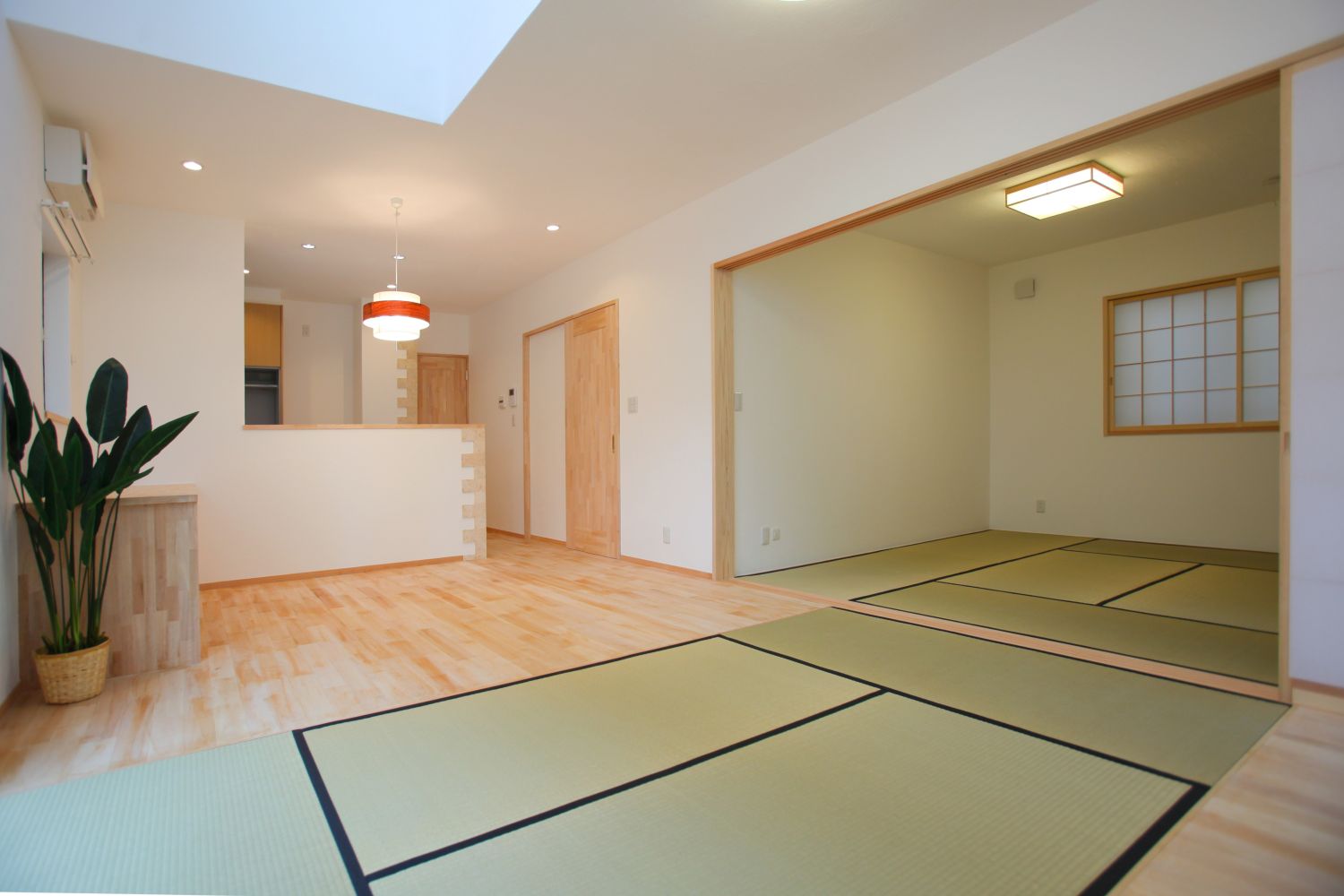 広々としたリビングダイニングには、無垢材を使用したオーダーメイドのテレビ台を設置。随所に設けた収納スペースですっきりとした空間を維持できます。床材には無垢のアカシアを採用。硬く傷がつきにくい性質に加え、柿渋塗装を施すことで防腐・防虫効果を高めています。