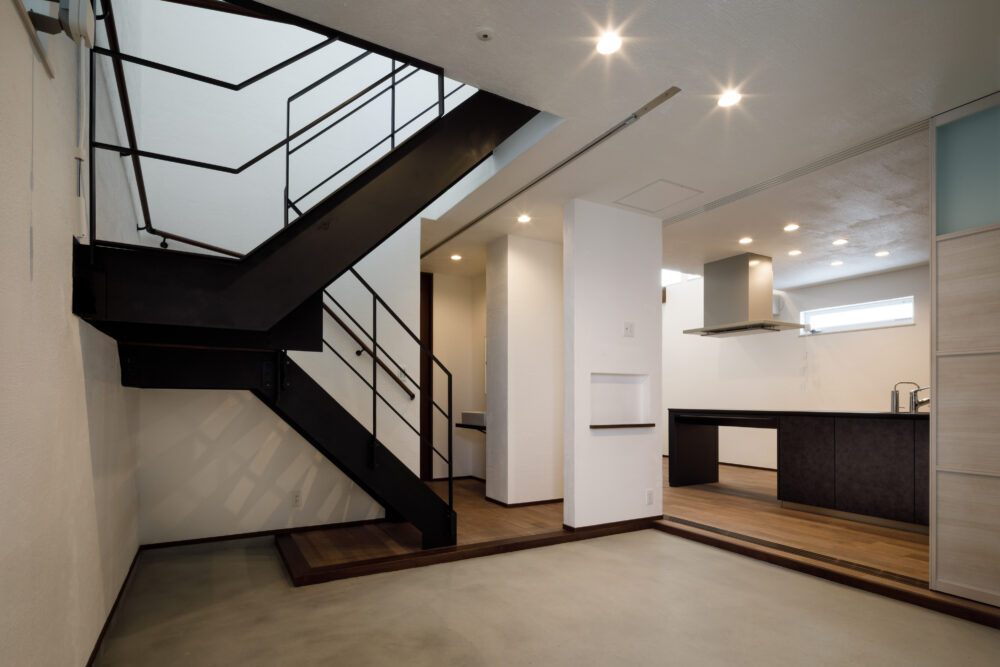 漆喰×サイディングの外観が目を引く、スタイリッシュで上品な佇まい。 室内には無垢材の床を採用し、裸足で歩くと心地よい質感を楽しめます。部屋ごとに異なる木材を使用することで、空間ごとの雰囲気に変化をもたせました。