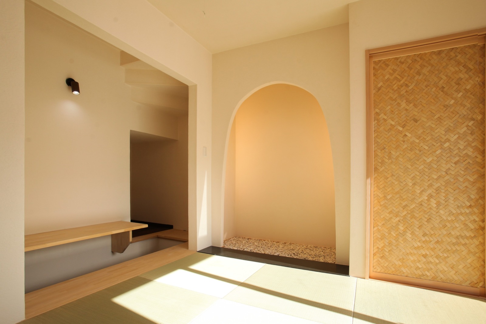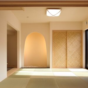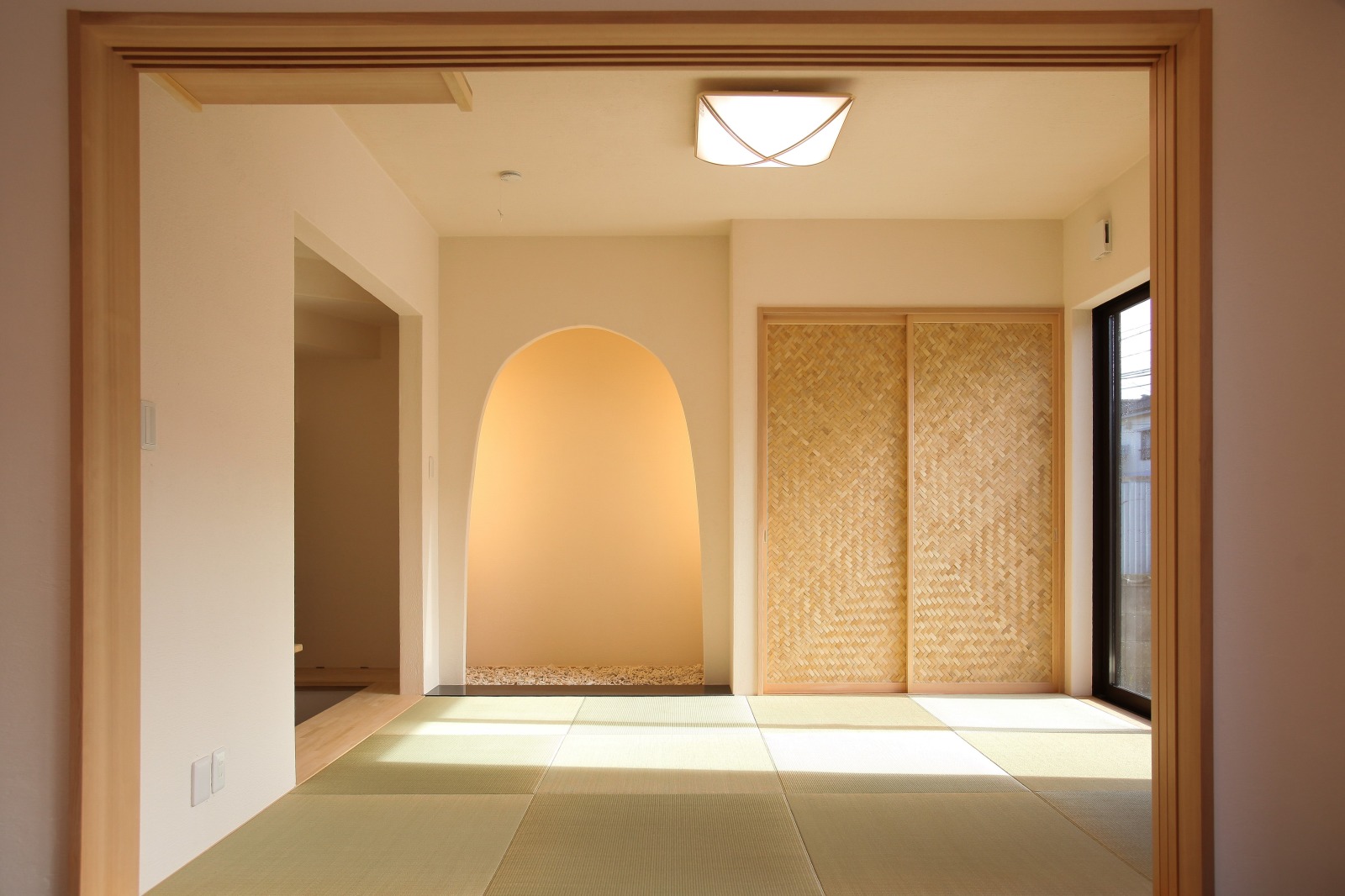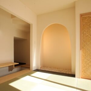 玄関ホールに足を踏み入れると、柔らかな光に照らされた石造りのニッチがお客様を優しく迎えます。リビングダイニングの先に広がるのは、この家の象徴ともいえる和室。陽光が差し込む温かな空間に、間接照明が美しい陰影を描く丸みのある床の間をしつらえました。誰もが自然と集まり、くつろぎの時間を共有できる工夫が凝らされています。