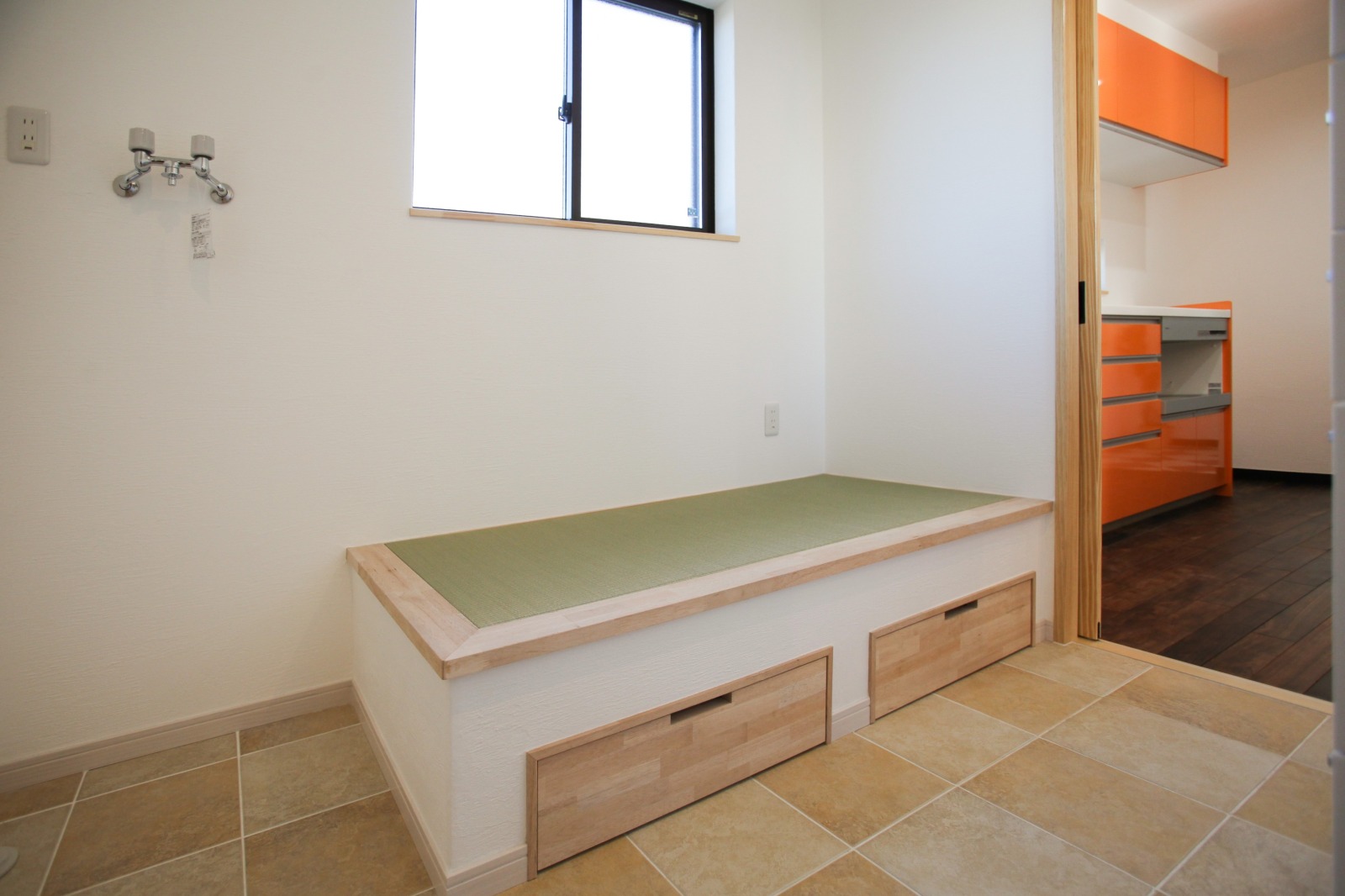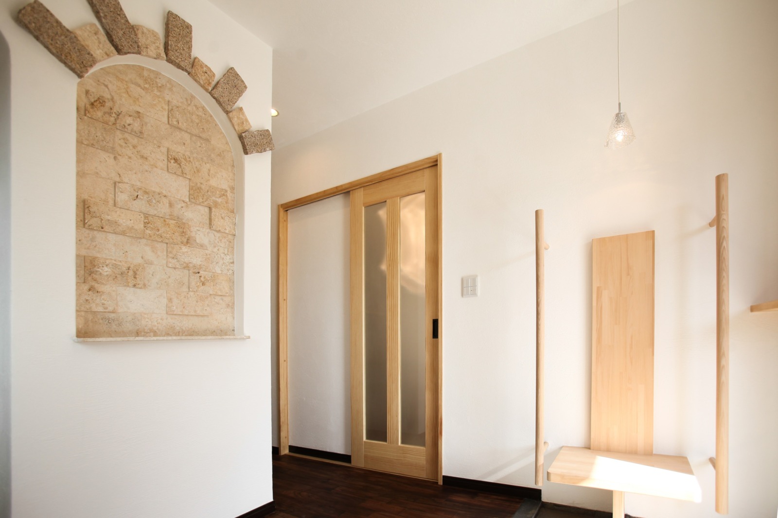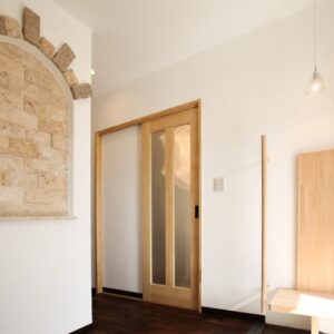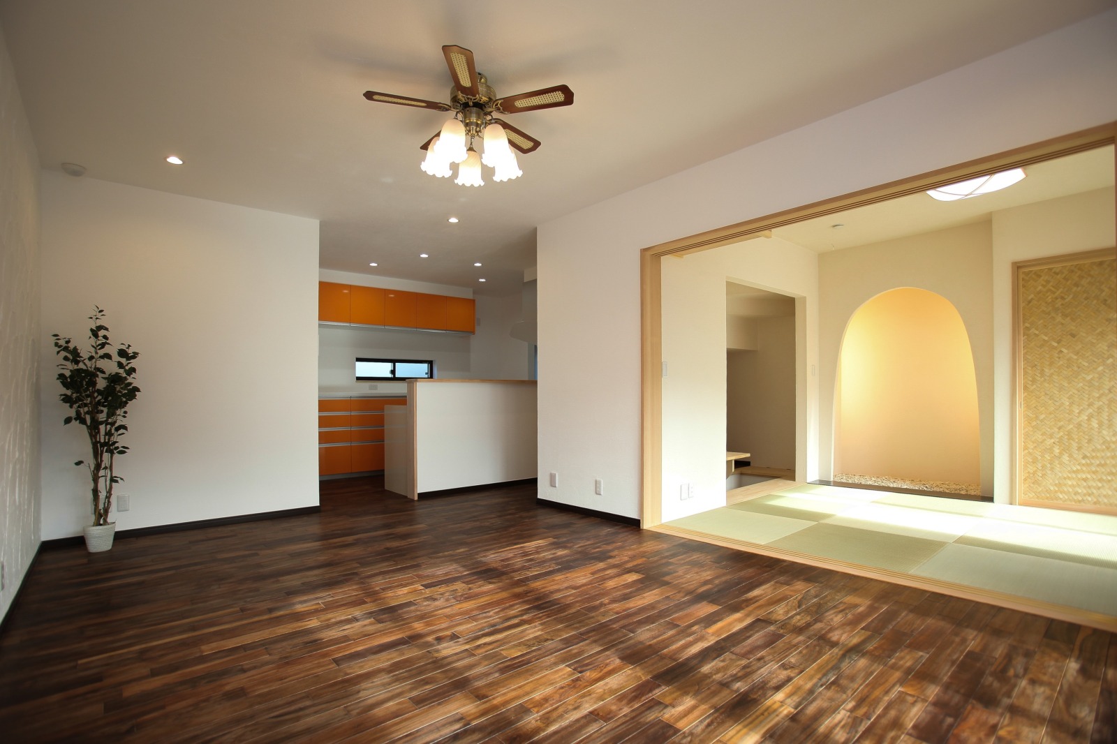 玄関ホールに足を踏み入れると、柔らかな光に照らされた石造りのニッチがお客様を優しく迎えます。リビングダイニングの先に広がるのは、この家の象徴ともいえる和室。陽光が差し込む温かな空間に、間接照明が美しい陰影を描く丸みのある床の間をしつらえました。誰もが自然と集まり、くつろぎの時間を共有できる工夫が凝らされています。