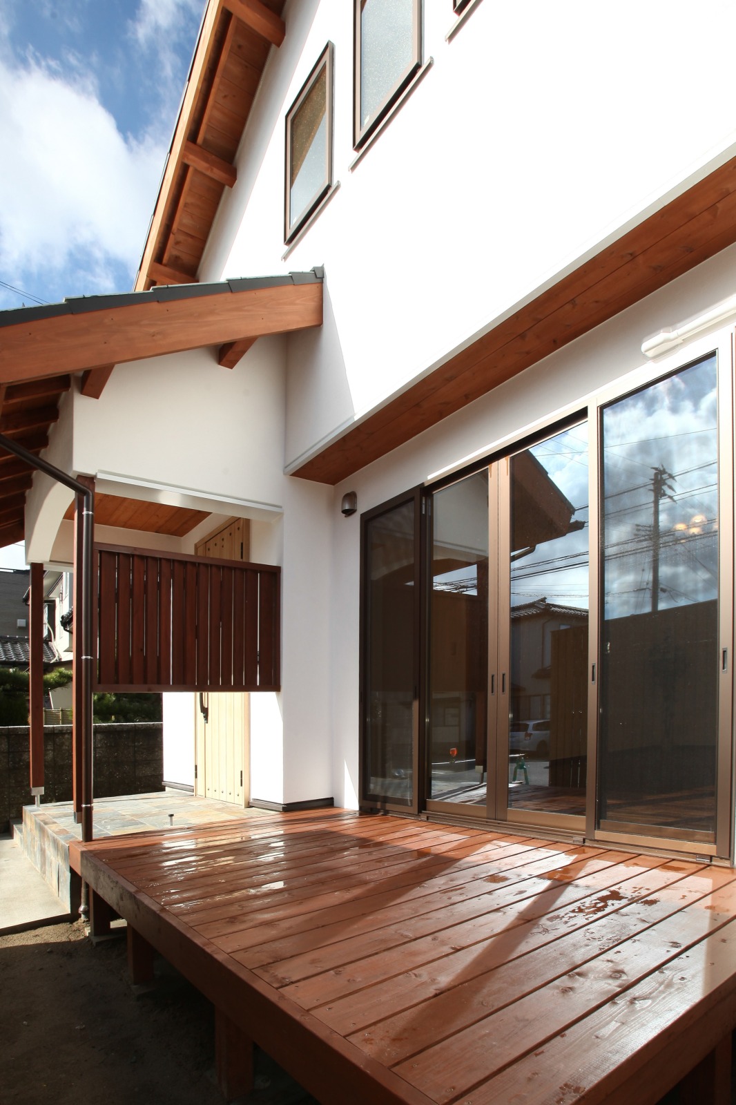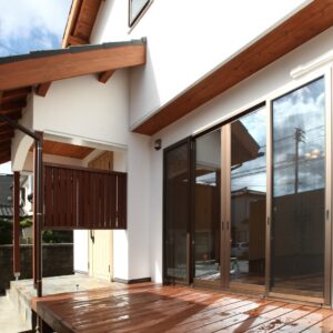 リビングとフラットにつながる広々としたウッドデッキは、内と外を繋ぐもう一つのおもてなし空間。晴れた日には、友人たちと語らう心地よいアウトドアリビングになります。