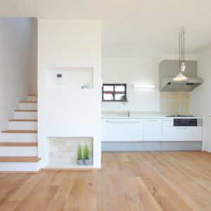 リビングは、漆喰の塗り壁とヨーロピアンオークの無垢材で統一され、木の温もりと自然素材の心地よさに満ちています。