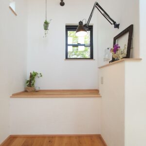 ワークスペースは、スキップフロアと吹き抜けで縦への広がりが心地よい、開放感あふれる空間となっています。壁で仕切られていないため家族の気配を感じつつ、仕事場としてだけでなく、趣味や読書を楽しむのにも最適です。