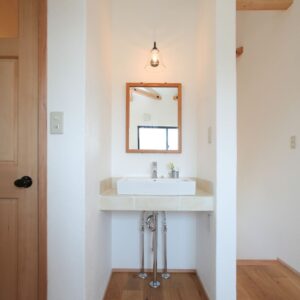 玄関には大容量の造作靴棚、リビングにはマガジンニッチを設け、デザイン性と収納力を両立。キッチン背面の階段下収納や、2階ホールの枕棚とハンガーパイプ付きクローゼット、オリジナルの洗面化粧台など、随所に暮らしやすさを高める工夫が光ります。