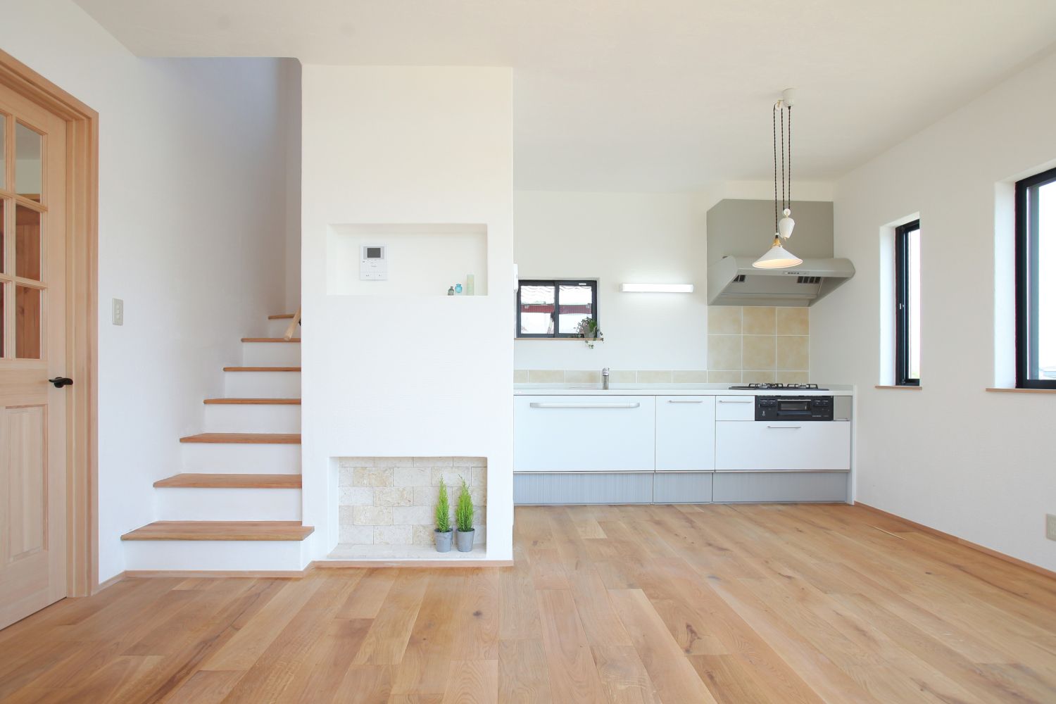 リビングは、漆喰の塗り壁とヨーロピアンオークの無垢材で統一され、木の温もりと自然素材の心地よさに満ちています。