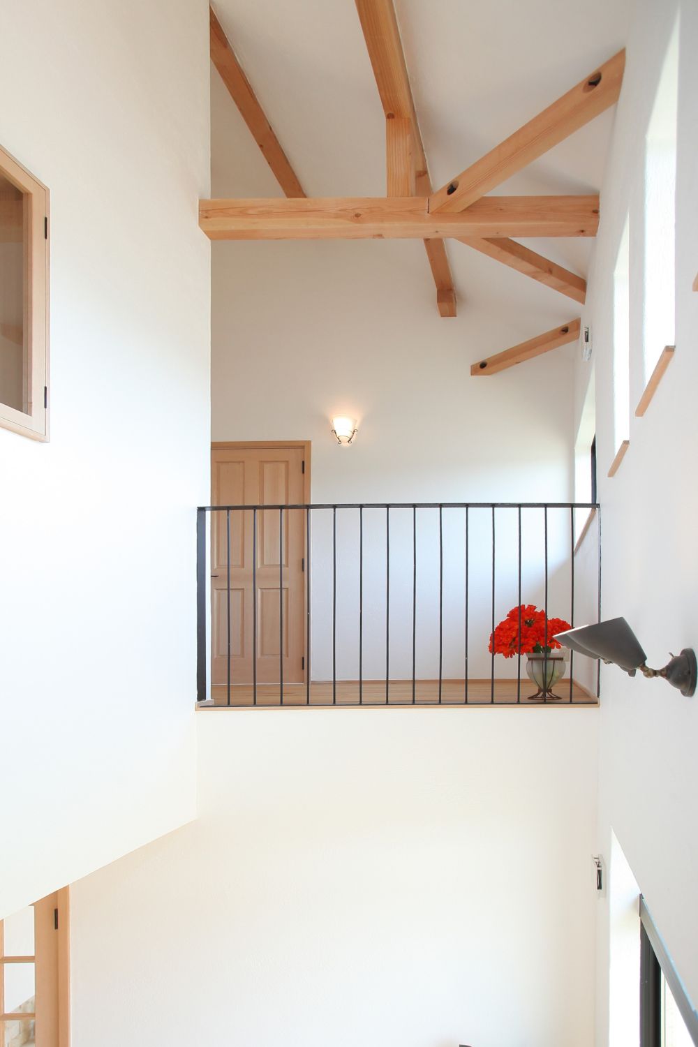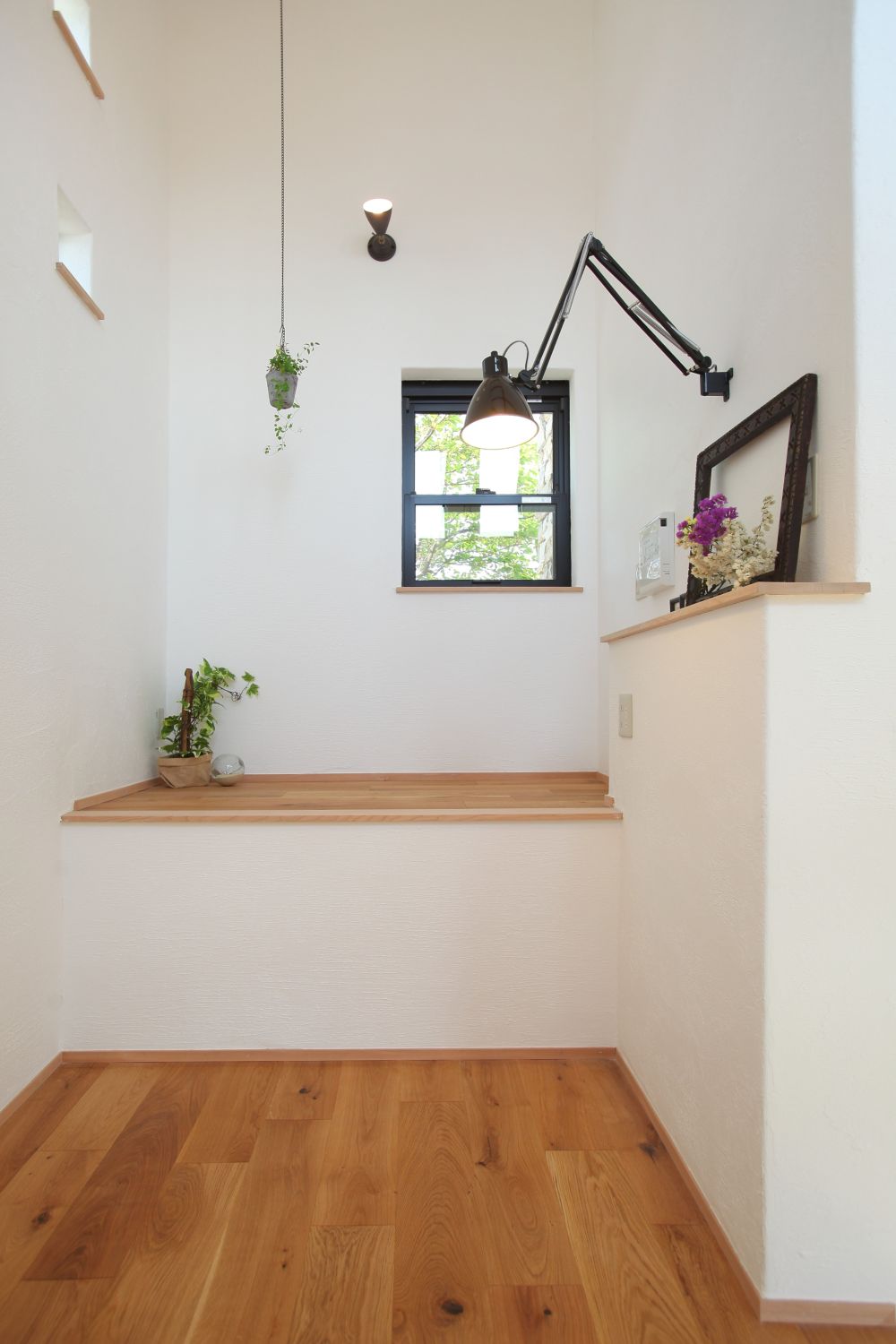 ワークスペースは、スキップフロアと吹き抜けで縦への広がりが心地よい、開放感あふれる空間となっています。壁で仕切られていないため家族の気配を感じつつ、仕事場としてだけでなく、趣味や読書を楽しむのにも最適です。