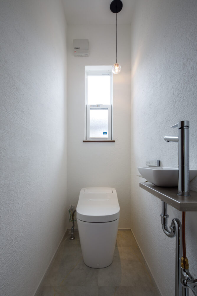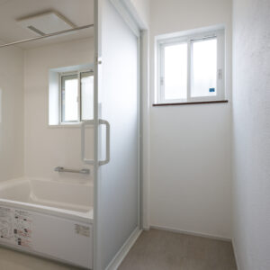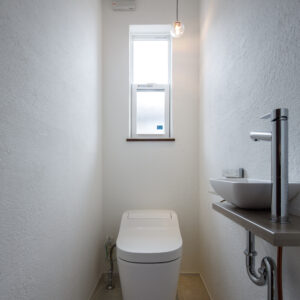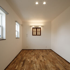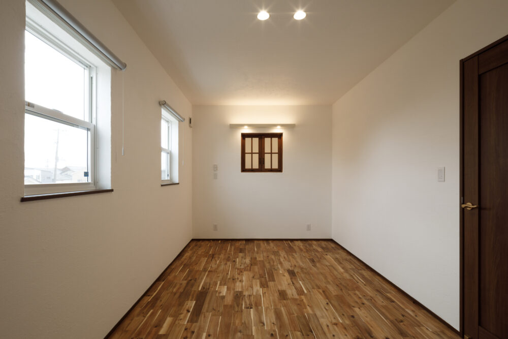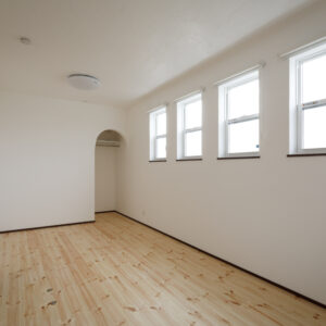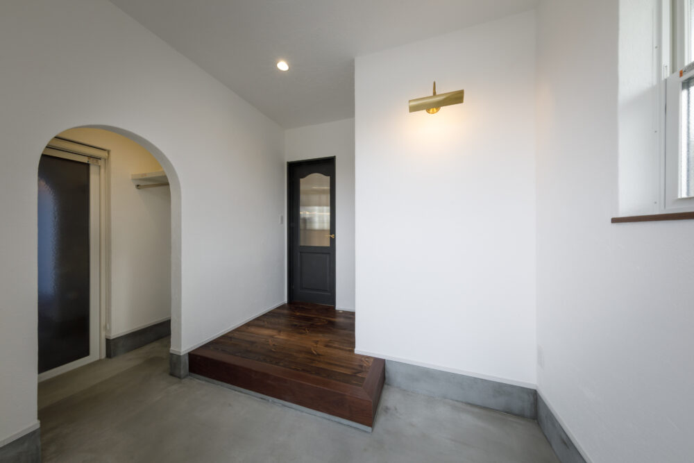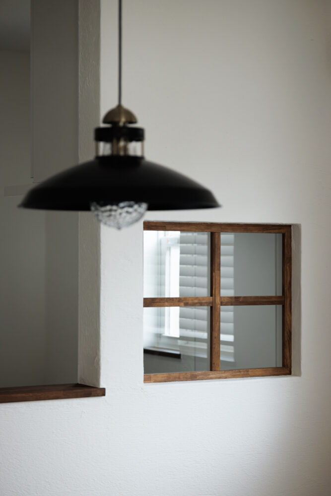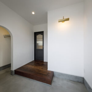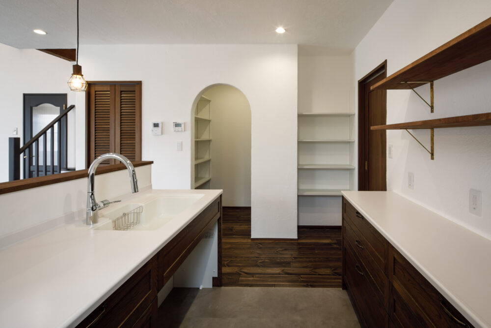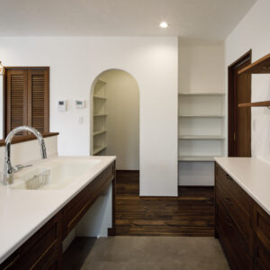 2階主寝室には吹き抜けとつながる造作の室内窓を設置し、リビングにいる家族の気配を感じながらもほどよい距離感を保てるアクセントに。さらに玄関ホールやパントリー、ウォークインクローゼットなどの入口にはアーチ壁を採用し、住まい全体にやわらかな印象を与えています。