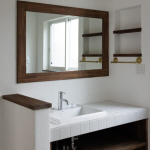 造作洗面台は白いタイルと無垢材を組み合わせたデザインで、真鍮色のタオルバーや壁面ニッチ、無垢材で縁取った鏡が空間にさりげないアンティークの雰囲気を添えています。