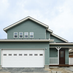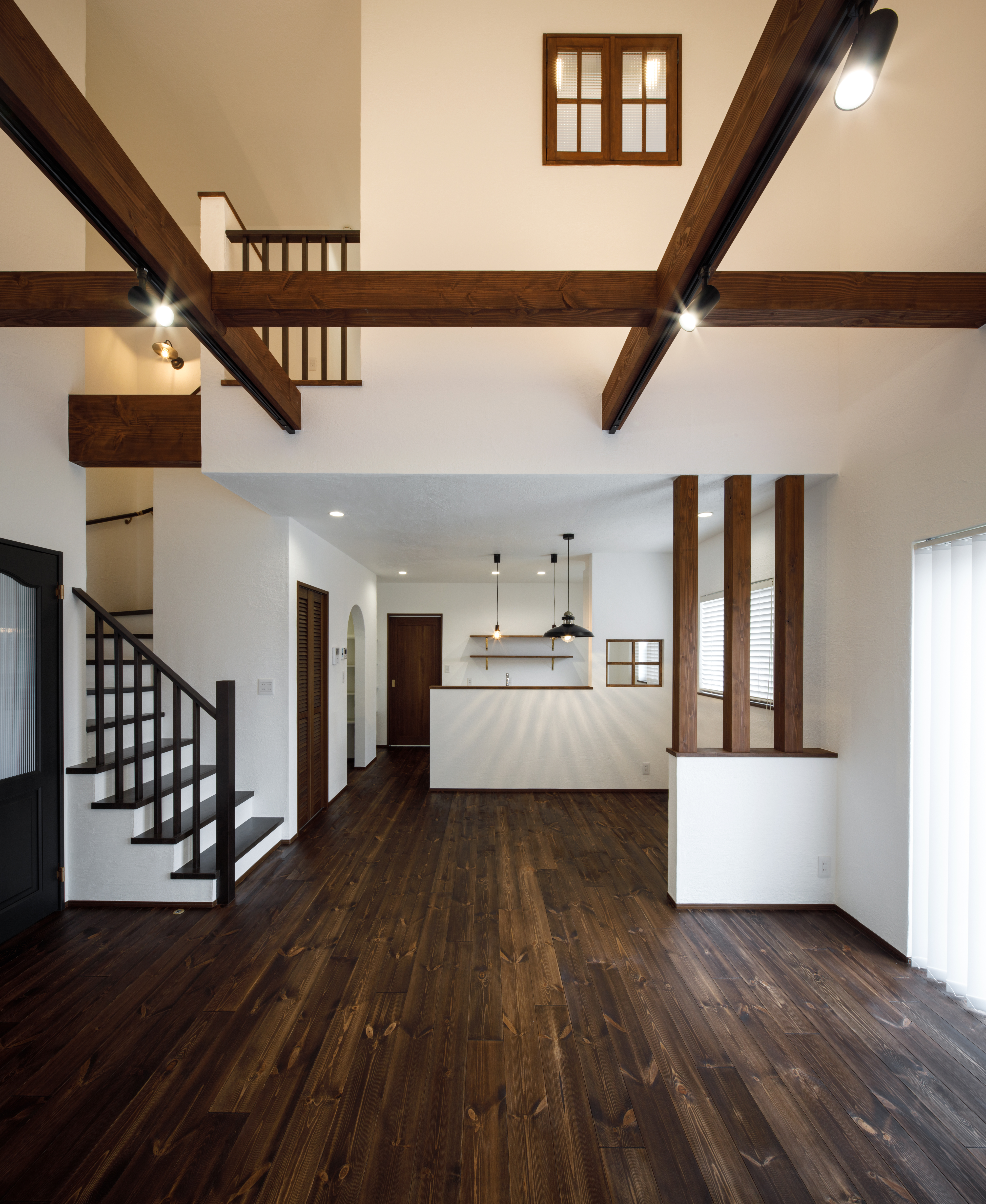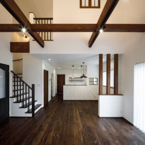 白く美しい漆喰の壁に、ビターチョコ色の落ち着いたトーンの無垢フローリングと力強い化粧梁が映える住まい。インナーガレージを備えた機能的な間取りに自然素材を取り入れ、日々の暮らしの中で心地よさを感じられる空間に仕上がりました。