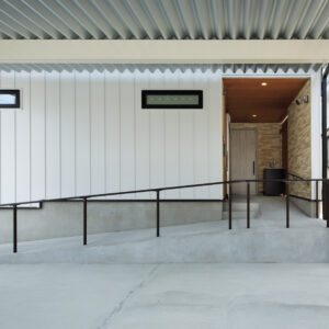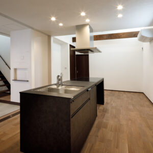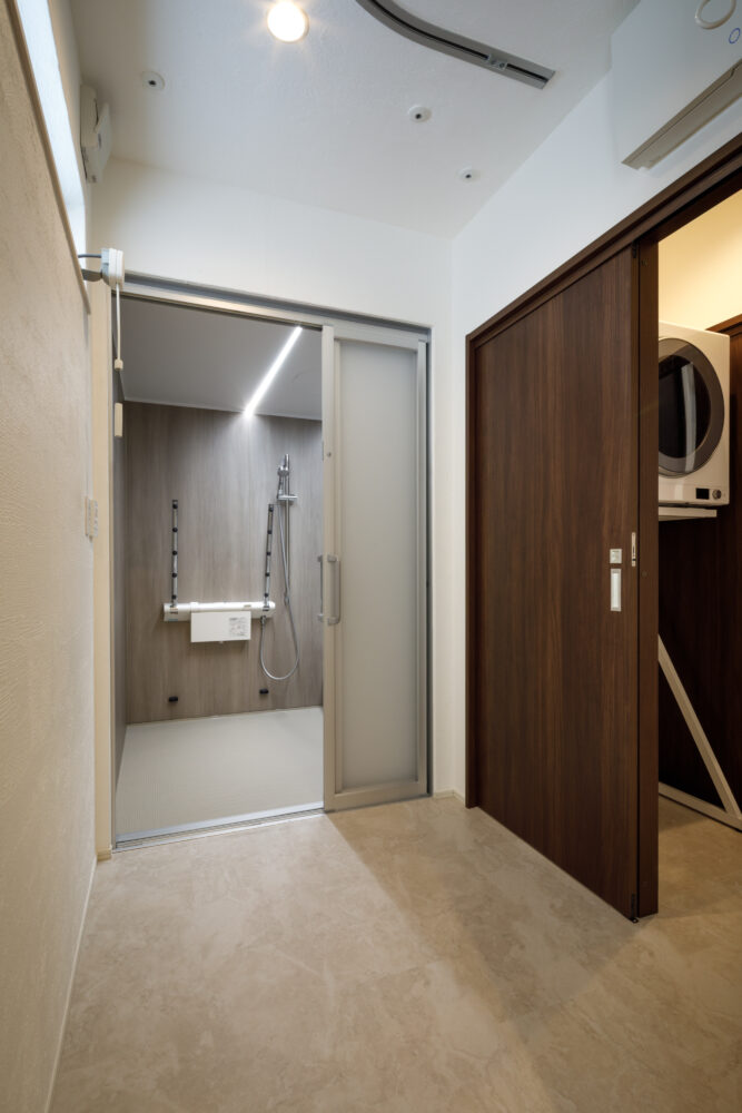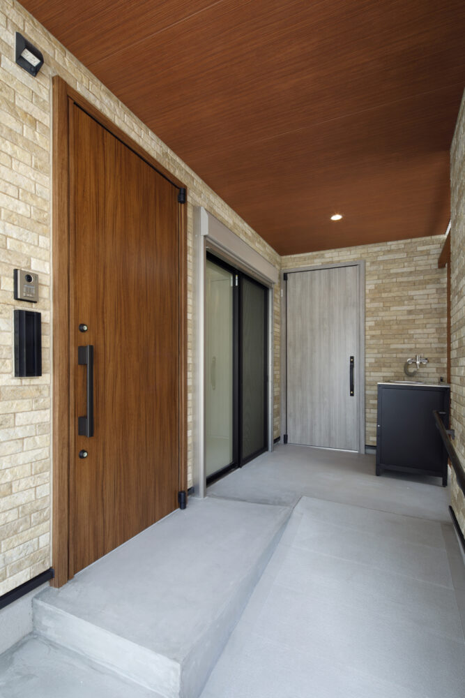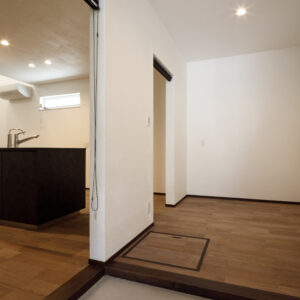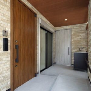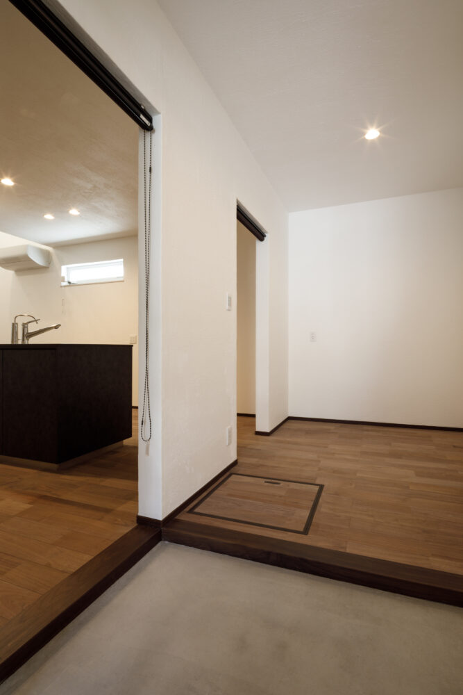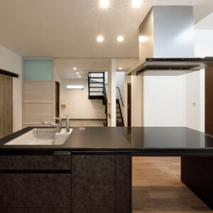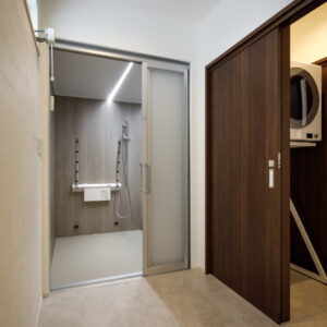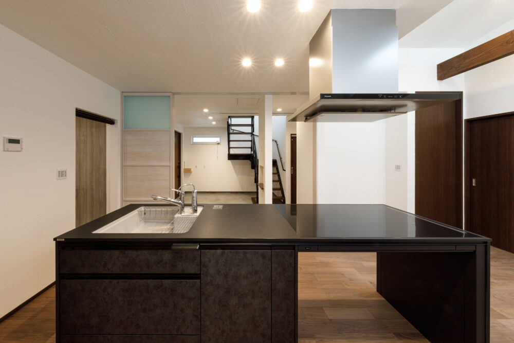 キッチンには、Panasonic L-CLASSの「アイランド型Iroriダイニング」を設置し、3口並んだIHを中心に家族が自然と集まる設計に。玄関から続く広い土間は、4枚引き違い戸を開け放てばリビングと一体化する開放的な大空間へと広がります。外構のスロープから室内まで段差を極力なくし、浴室付近までスムーズに移動できる動線を確保するなど、バリアフリー設計を徹底。収納はパントリーに集約し、日々の生活動線をシンプルに整えました。