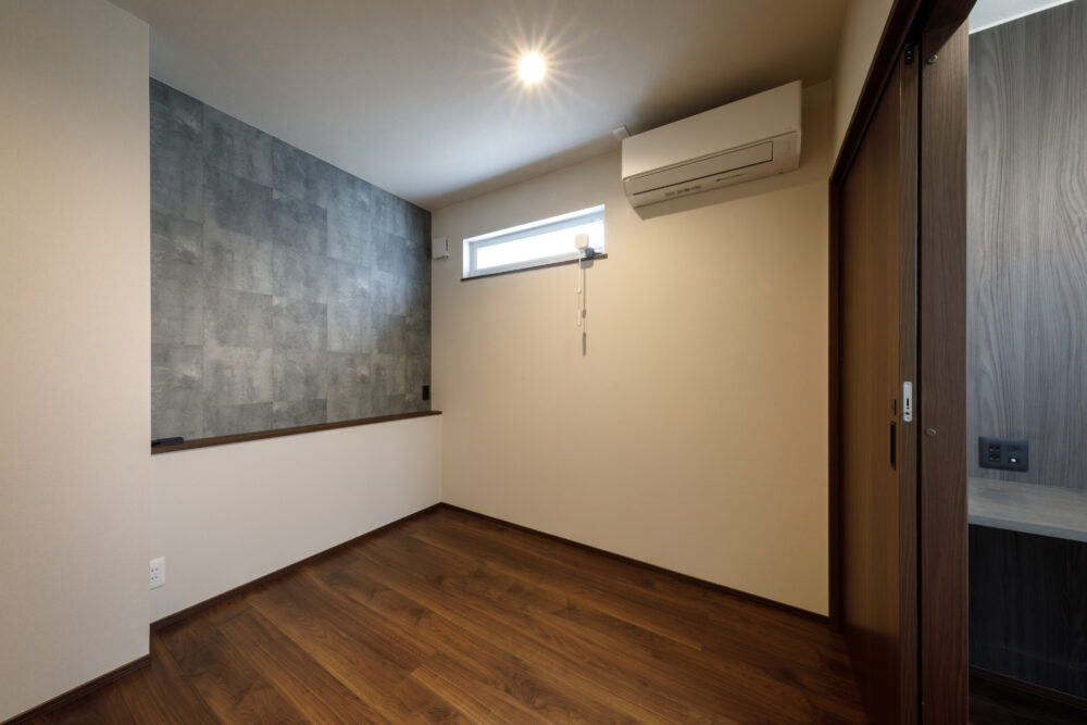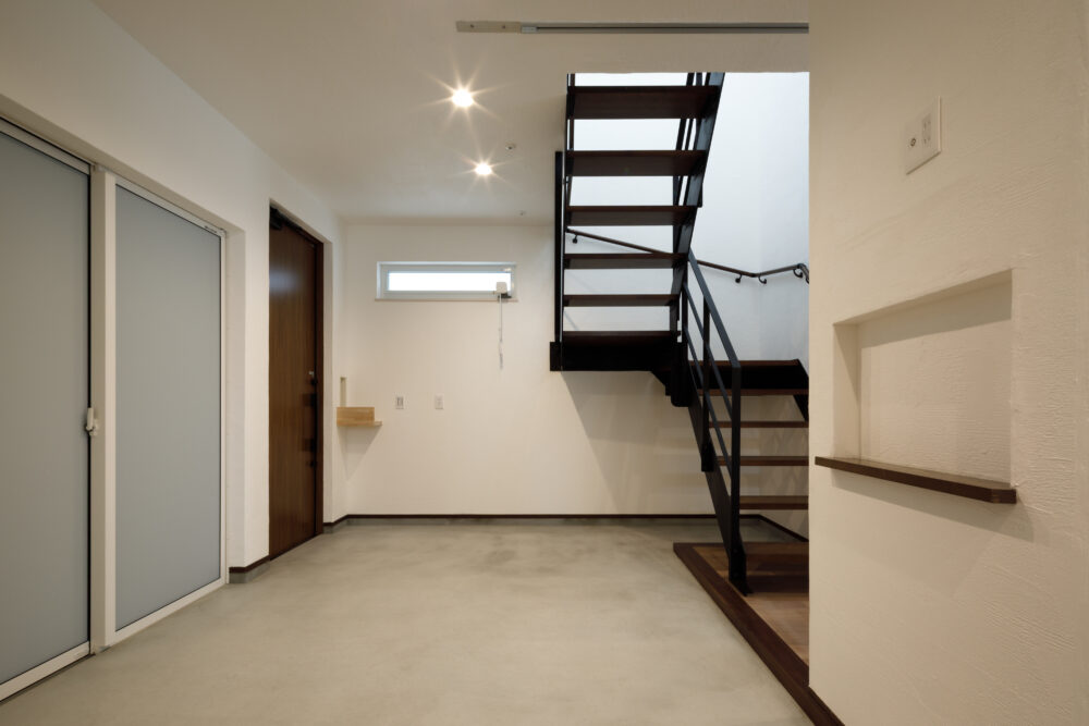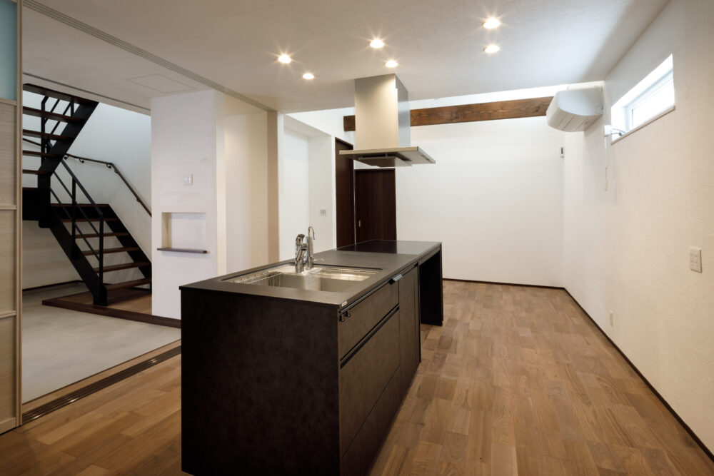外観は、白いストライプ系の金属サイディングに黒縁サッシと意匠性の高い雨樋を組み合わせた、シャープでスタイリッシュな佇まいに。1階は自然素材の心地よさを活かした空間で、壁と天井には調湿効果のある無添加住宅オリジナル漆喰、床には重厚感のあるブラックウォールナットの無垢フローリングを採用しました。