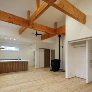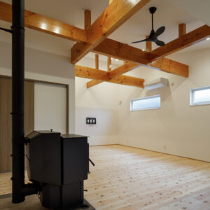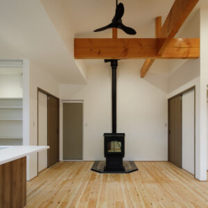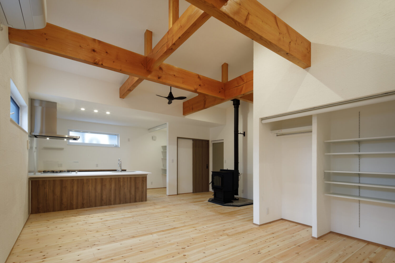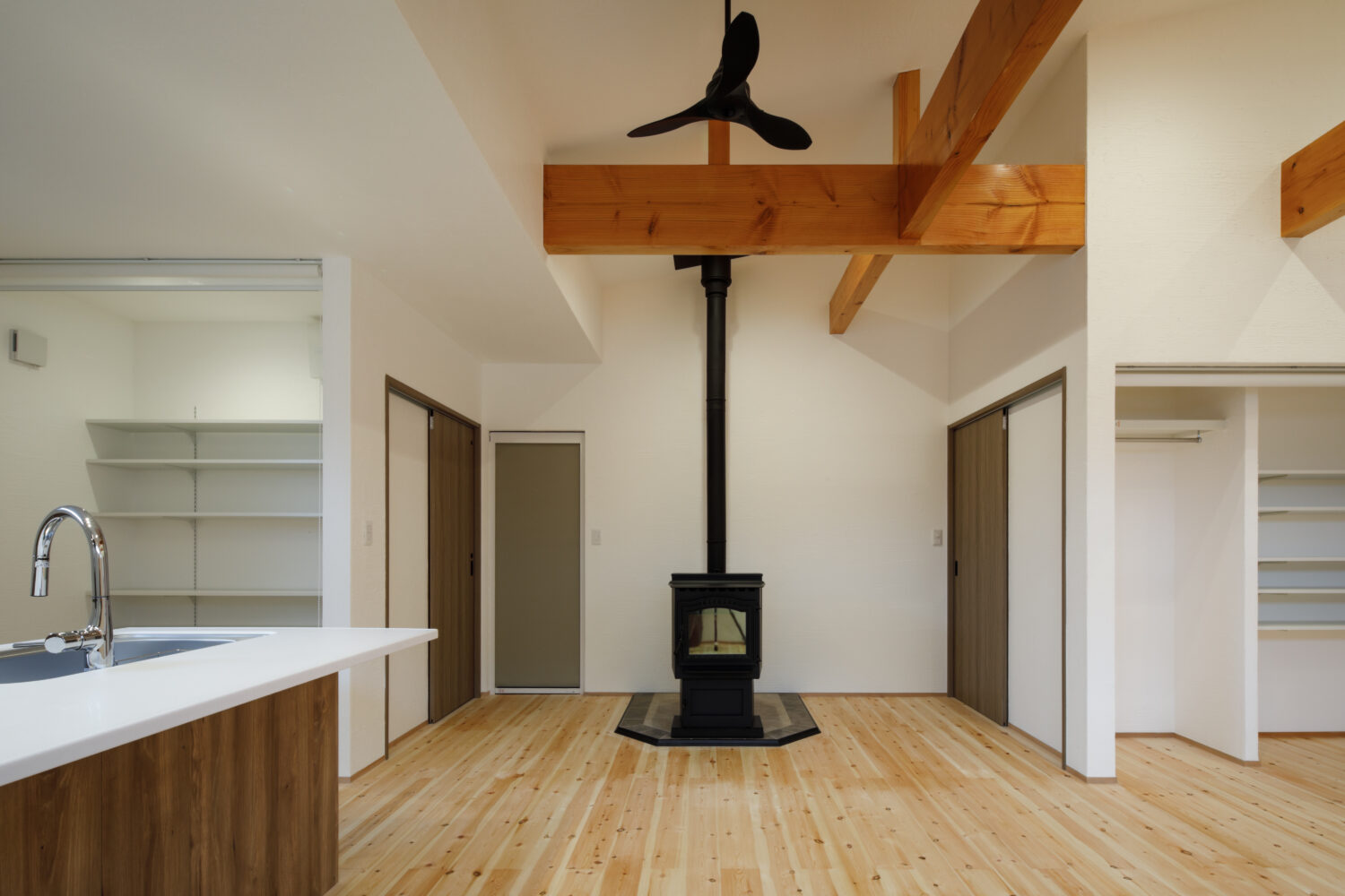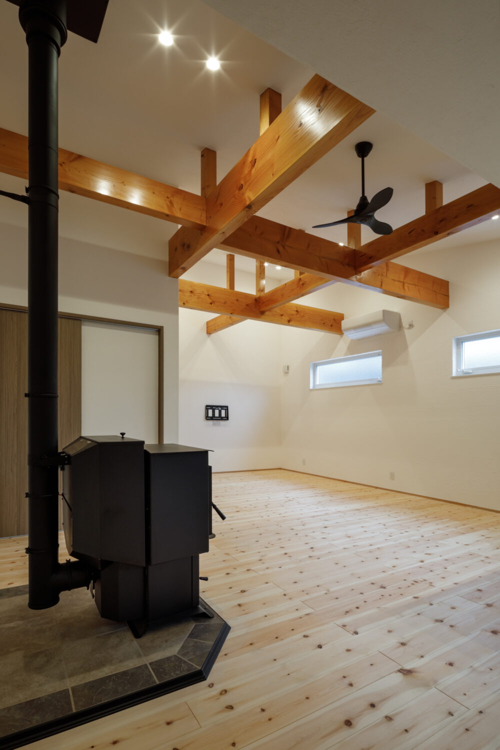 空間のアクセントとなるのが、大胆に表しにした化粧梁。木の素材感をそのまま活かした梁が、空間にリズムと奥行きを与えています。また、リビングの中心にはお施主様こだわりのペレットストーブを設置。デザイン性と機能性を兼ね備えた一台が、住まいのシンボルとして存在感を放ちます。