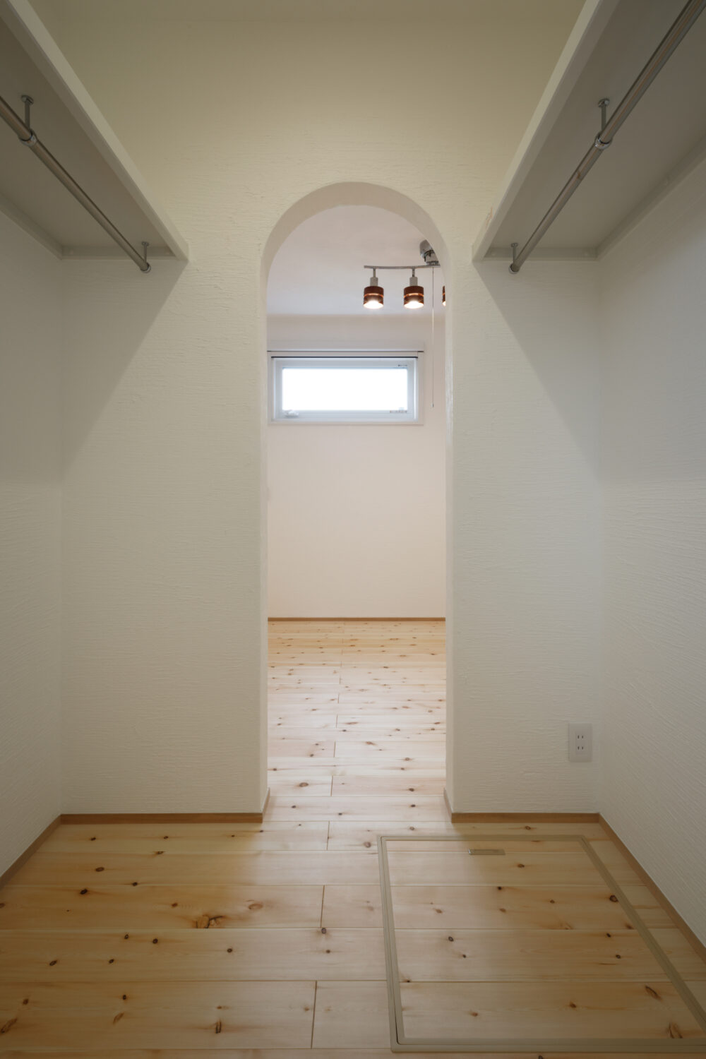 室内に入ると、勾配天井による開放的なリビング空間が広がります。天井高を活かした設計により、実際の面積以上の広さと心地よさを感じられるのが特徴です。無垢フローリングのやさしい質感と漆喰の壁が、自然素材ならではの温もりを演出します。